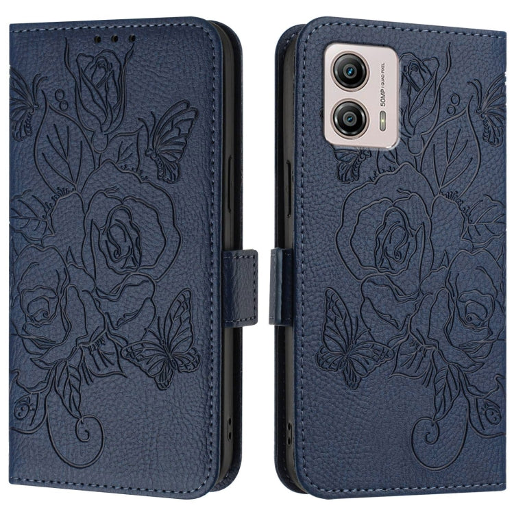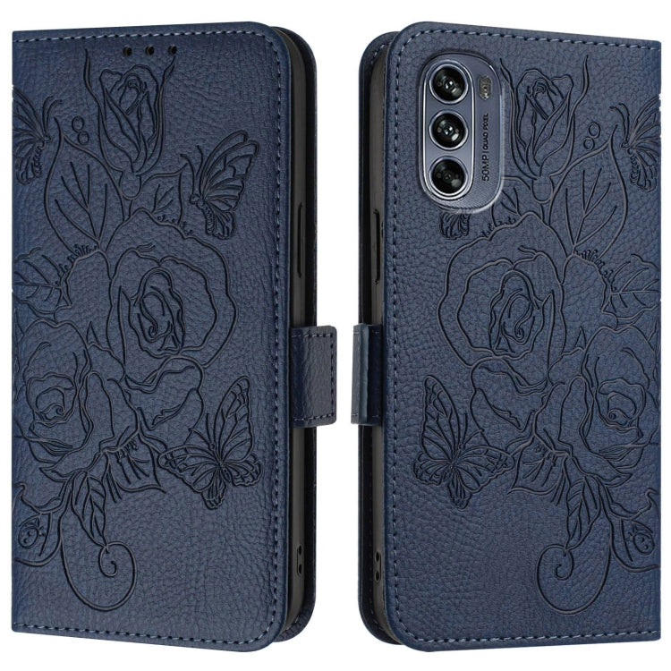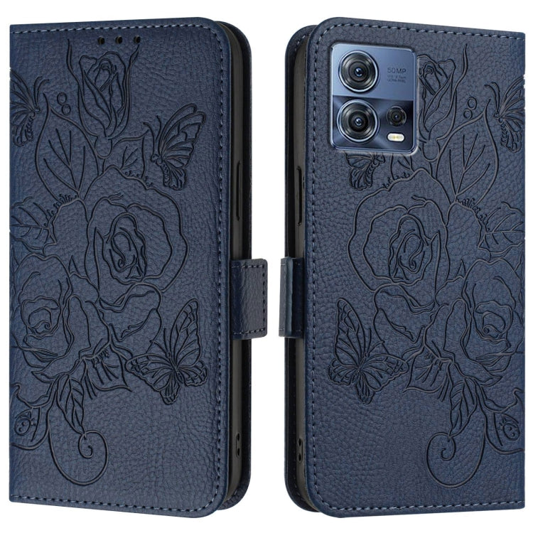 Funda de Cuero Antirrobo RFID con Relieve Rosa para Motorola Moto S30 Pro 5G (Azul Oscuro)