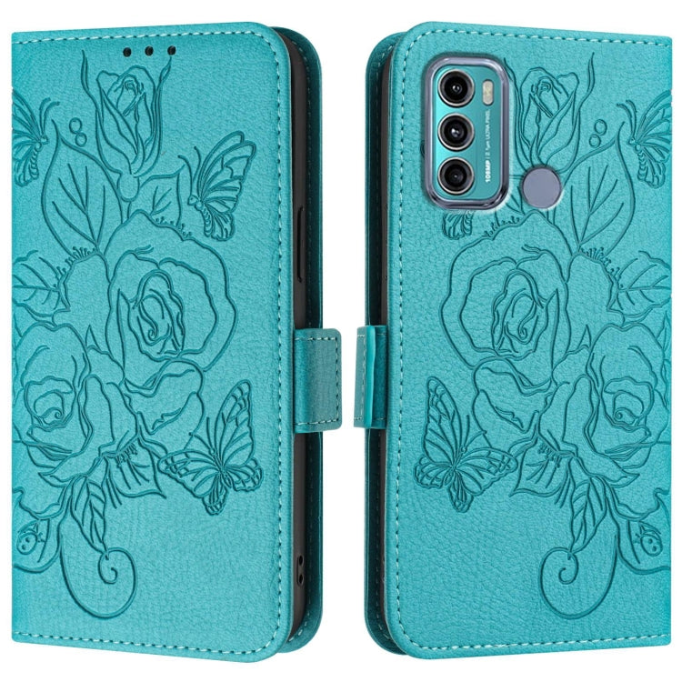 Funda de Cuero Antirrobo RFID con Relieve Rosa para Motorola Moto G60/G40 Fusion (Azul Claro)