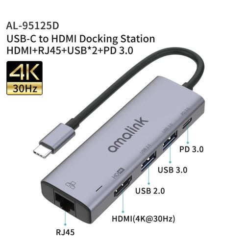- 1x Hub Multifunción Amalink 95125D Tipo-C USB-C a HDMI RJ45 2 Puertos USB Pd 3.0 (Gris)