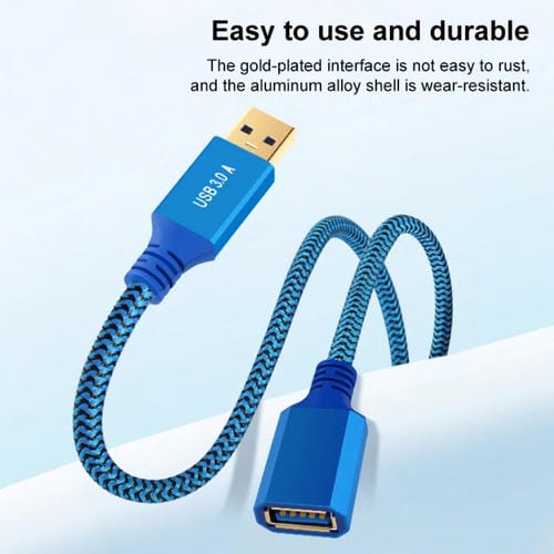 El Cable de extensión USB 3.0 Macho a Hembra (0,3 m, Azul) está diseñado para ampliar la Conexión USB de dispositivos como impresoras, Discos duros externos y Computadoras Portátiles con interfaz USB 3.0. Su función principal es facilitar la extensión de la Conexión USB, mejorando la accesibilidad y comodidad en entornos de trabajo y oficina. Este Cable garantiza una transferencia de datos segura y eficiente gracias a su blindaje antiinterferencias de tres capas y su interfaz chapada en oro, que previene la oxidación y asegura una Conexión estable y duradera.