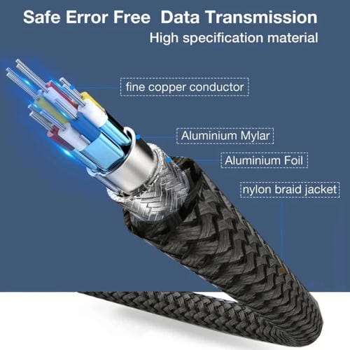 El Cable cuenta con núcleo de cobre puro y Conectores chapados en oro, además de una malla de nailon que protege contra el desgaste y la oxidación.