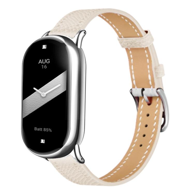 Correa de cuero con hebilla plateada fina para Xiaomi Smart Band 10/9/8 (textura de lichi, blanco marfil)