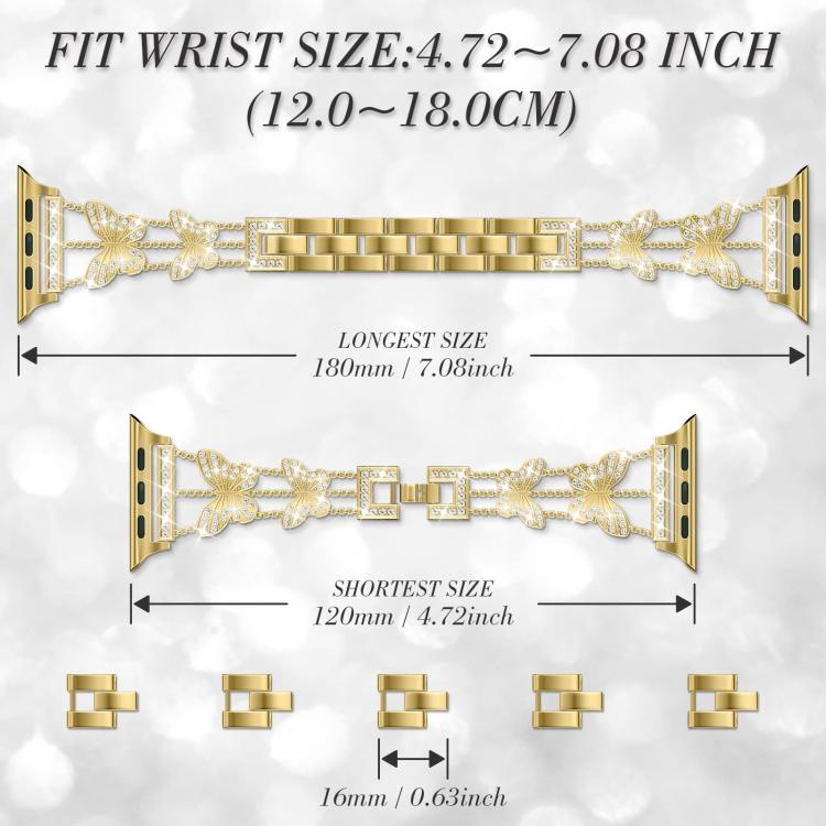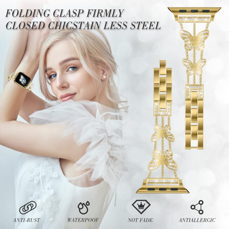 Correa de metal con diamantes en forma de mariposa para Apple Watch de 42, 44, 45, 46 y 49 mm (dorada)