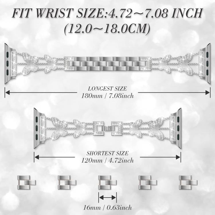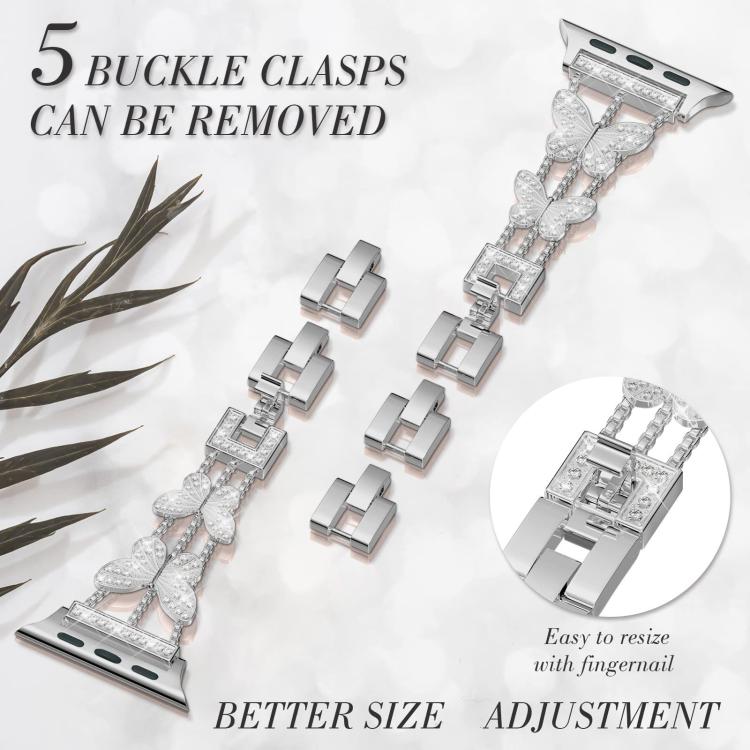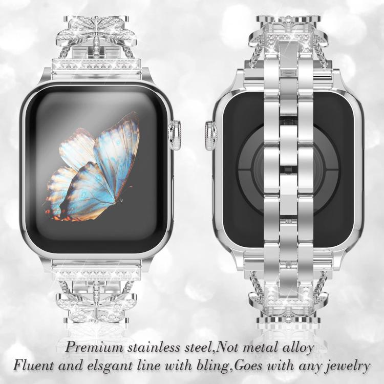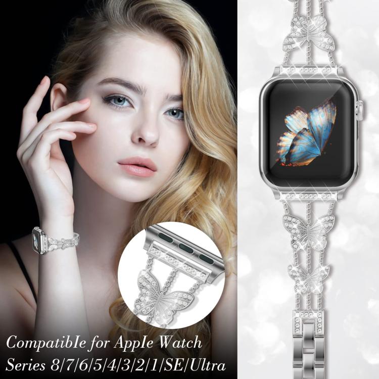 Correa de metal con diamantes en forma de mariposa para Apple Watch de 42, 44, 45, 46 y 49 mm (plata)