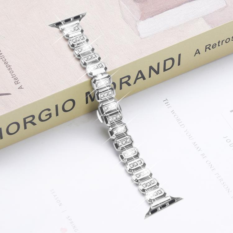 Correa de reloj con hebilla de mariposa y diamantes cuadrados pequeños para Apple Watch de 46 mm, 49 mm, 45 mm y 44 mm (plateada)
