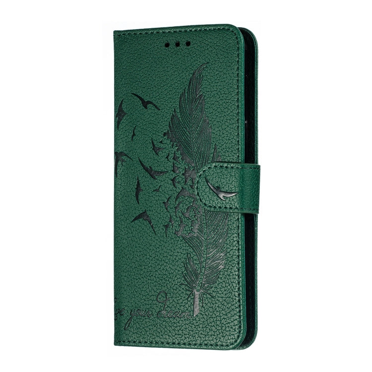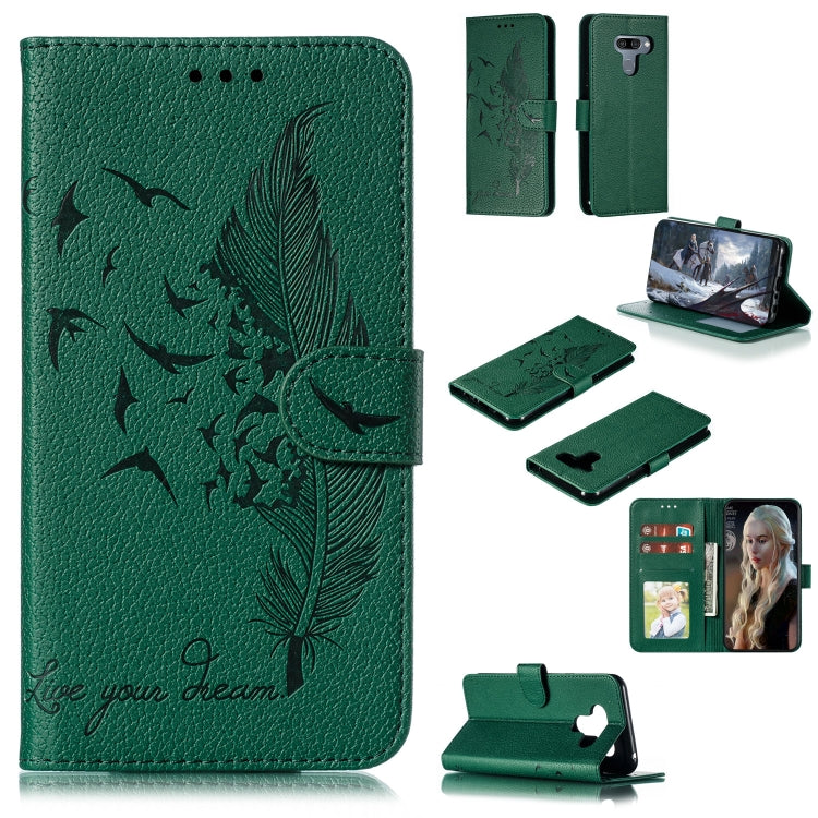 Estuche de Cuero con Tapa Horizontal para LG K50 con Textura Litchi, Patrón de Plumas, Billetera y Soporte (Verde)