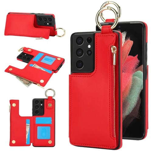 Estuche para Teléfono Samsung Galaxy S21 Ultra 5G Rfld con Cremallera y Anillo de Doble Hebilla Antirrobo (Rojo)