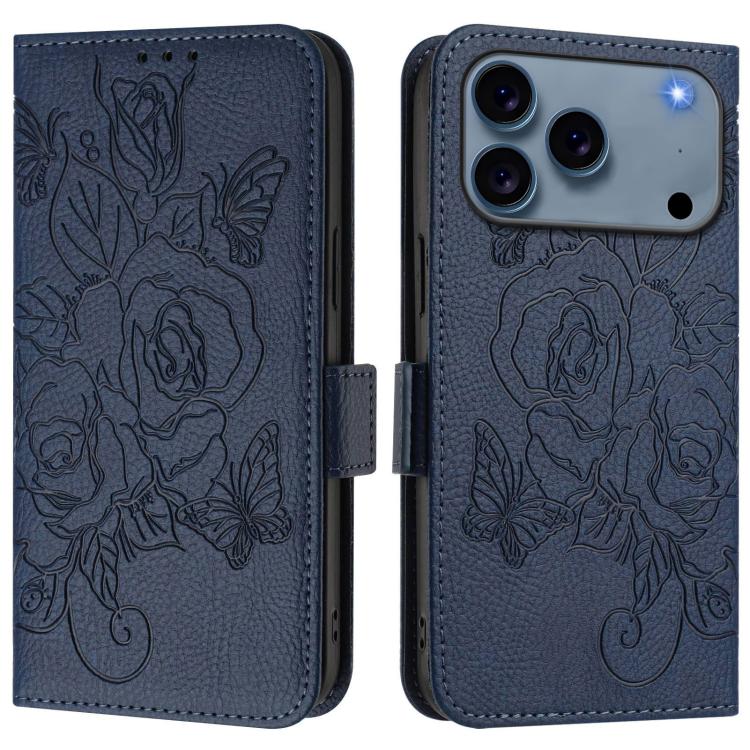 Funda de cuero antirrobo RFID con relieve rosa para iPhone 17 Pro Max (azul oscuro)