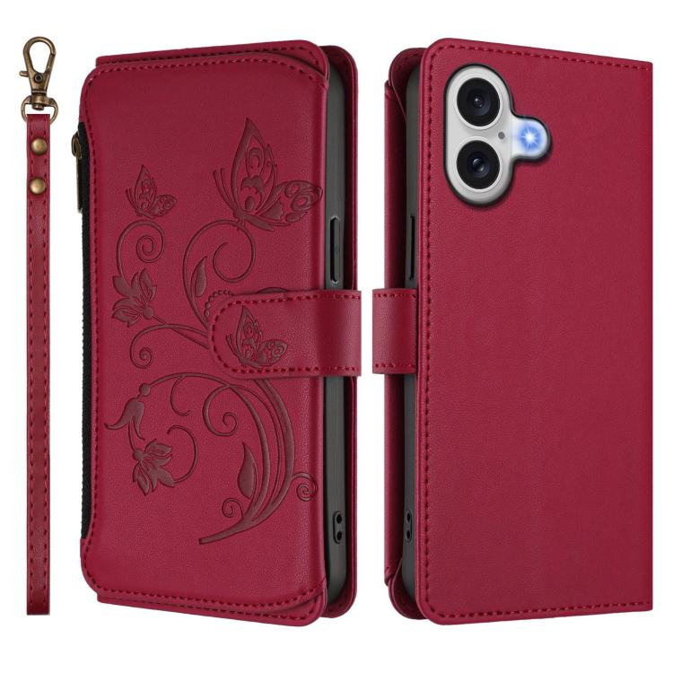 Funda de cuero con cremallera para iPhone 17, diseño de mariposas, flores y amor (rojo vino)