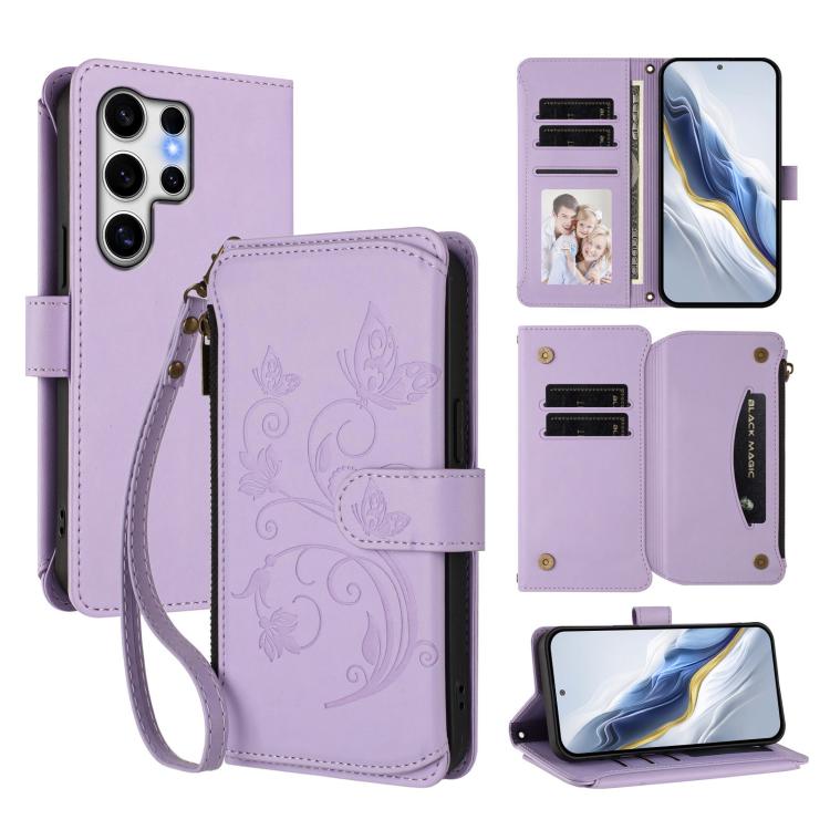 Funda de cuero con cremallera para Samsung Galaxy S25 Ultra 5G, diseño de mariposas, flores y amor, con múltiples tarjetas (morado claro)