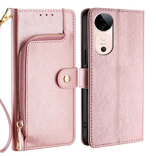 Funda de Cuero con Cremallera para Teléfono Vivo S19 (Oro Rosa)