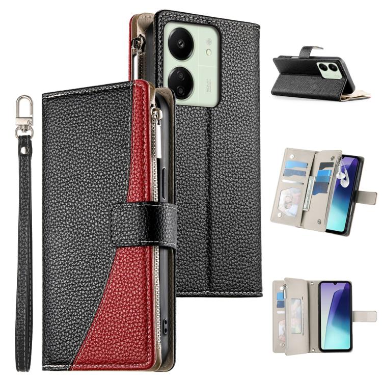 Funda de cuero con cremallera y múltiples tarjetas para Redmi 13C 4G / 5G / 13R / Xiaomi Poco C65 (negro)