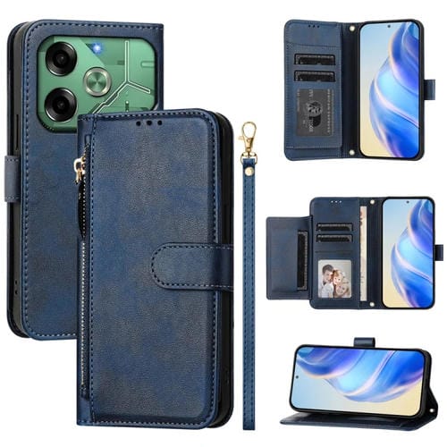 Funda de Cuero para Tecno Pova 6 4G con Cremallera y Ranuras para Tarjetas (Azul)