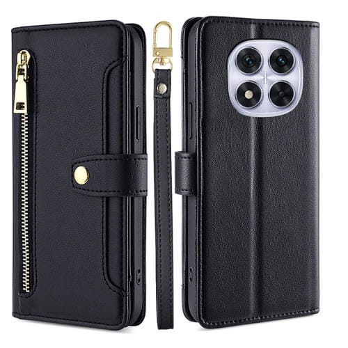 Funda de Cuero con Textura de Oveja para Redmi Note 14 Pro 5G, Tipo Cartera, con Cremallera y Bandolera (Negra)