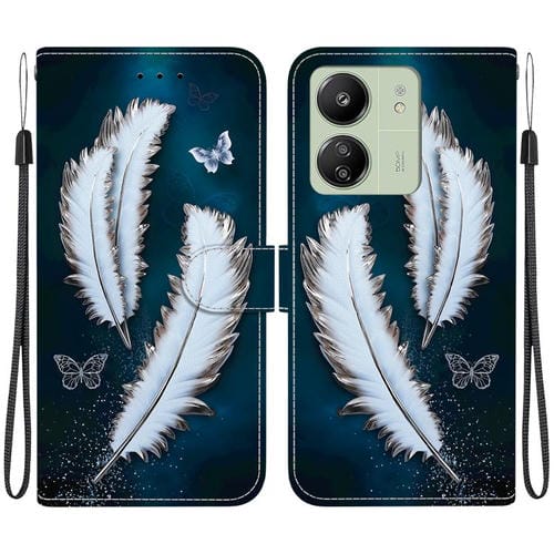 Funda de Cuero con Dibujo de Colores y Textura de Cristal para Redmi 13C 4G / 5G / 13R 5G (Plumas de Mariposa Blancas)