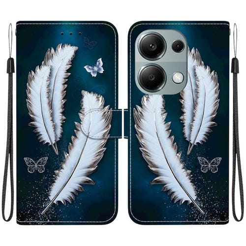 Funda de Cuero con Dibujo de Colores y Textura de Cristal para Redmi Note 13 Pro 4G / Poco M6 Pro (Plumas de Mariposa Blancas)