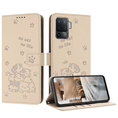 Funda de Piel con Diseño de Gatito En Relieve y Cordón para Oppo A94 4G / F19 Pro (Beige)