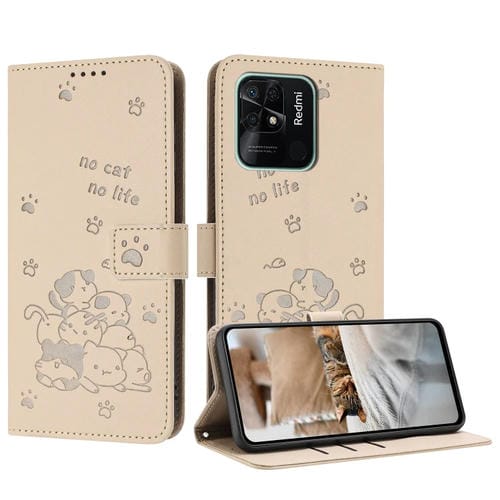 Funda de Piel con Diseño de Gatito En Relieve para Redmi 10C 4G Global con Cordón (Beige)