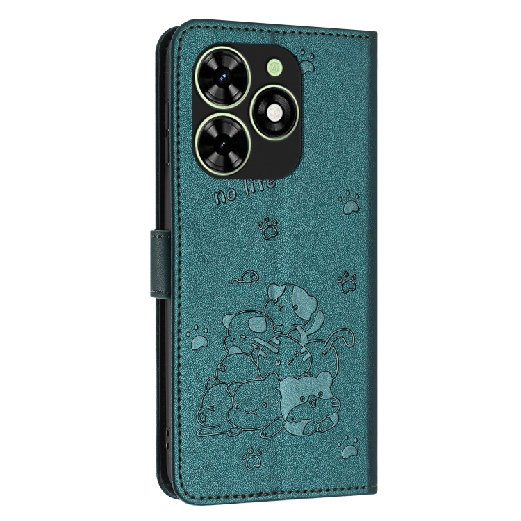 Funda de Cuero para Tecno Spark Go 2024 4G con Diseño de Gatito en Relieve y Cordón (Verde Oscuro)
