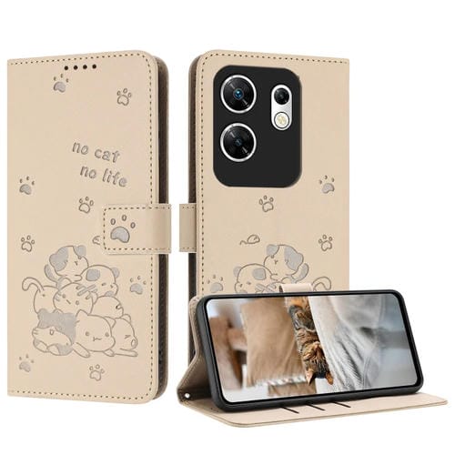 Funda de Cuero Infinix Zero 30 4G con Diseño de Gatito en Relieve y Cordón (Beige)