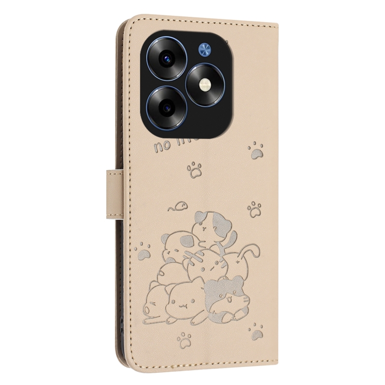 Funda de Cuero Itel S23+ con Diseño de Gatito en Relieve y Cordón (Beige)
