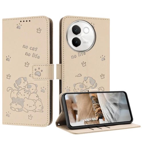 Funda de Piel con Diseño de Gatito En Relieve y Cordón para Vivo V30E 5G / V40 Lite 5G (Beige)