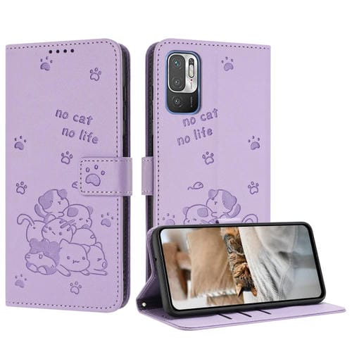 Funda de Piel con Diseño de Gatito En Relieve y Cordón para Xiaomi Poco M3 Pro 5G (Morado)