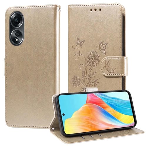 Funda de Cuero con Diseño de Mariposas y Flores En Relieve para Oppo A58 4G (Dorada)