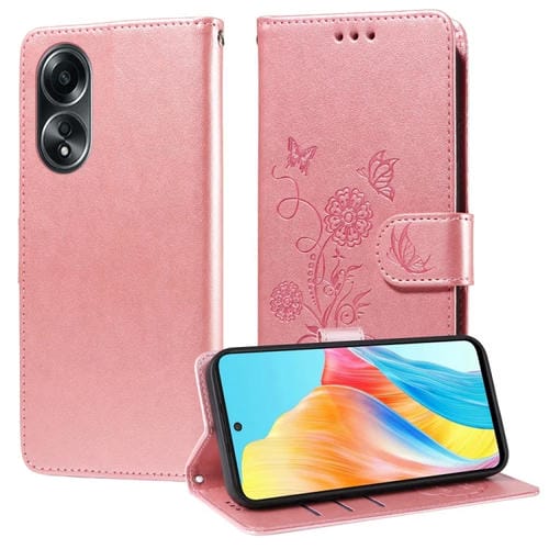 Funda de Cuero con Diseño de Mariposas y Flores En Relieve para Oppo A58 4G (Oro Rosa)