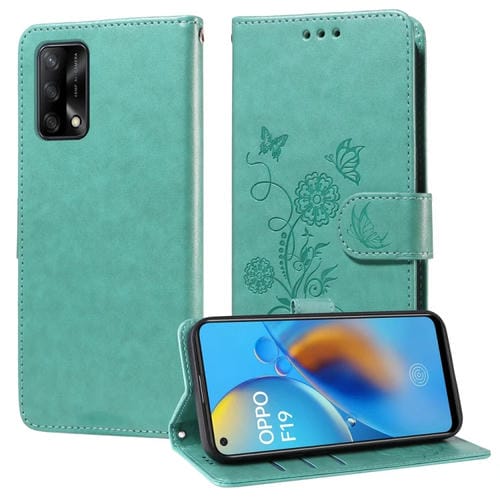 Funda de Cuero con Diseño de Mariposas y Flores En Relieve para Oppo A74 4G / F19 4G / F19S / A95 4G (Verde)