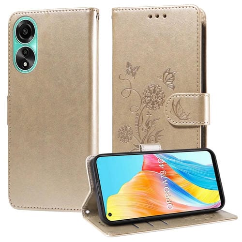 Funda de Cuero con Diseño de Mariposas y Flores En Relieve para Oppo A78 4G (Dorada)