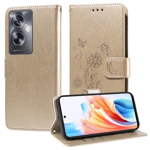 Funda de Cuero con Diseño de Mariposas y Flores En Relieve para Oppo A79 5G (Dorada)