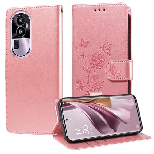 Funda de Cuero con Diseño de Mariposas y Flores En Relieve para Oppo Reno10 Pro+ (Oro Rosa)