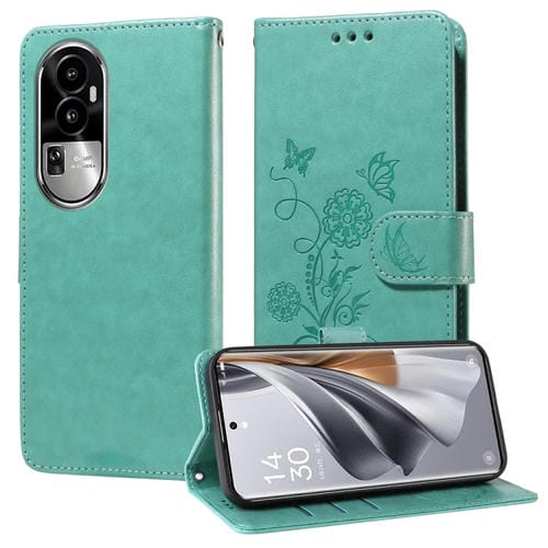 Funda de Cuero con Diseño de Mariposas y Flores En Relieve para Oppo Reno10/Reno10 Pro (Verde)