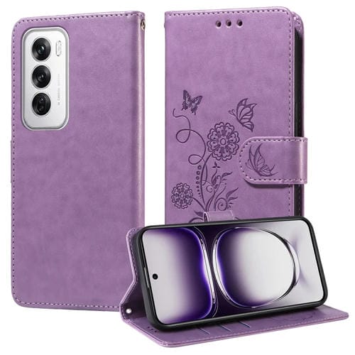 Funda de Cuero con Diseño de Mariposas y Flores En Relieve para Oppo Reno12 5G (Morado)
