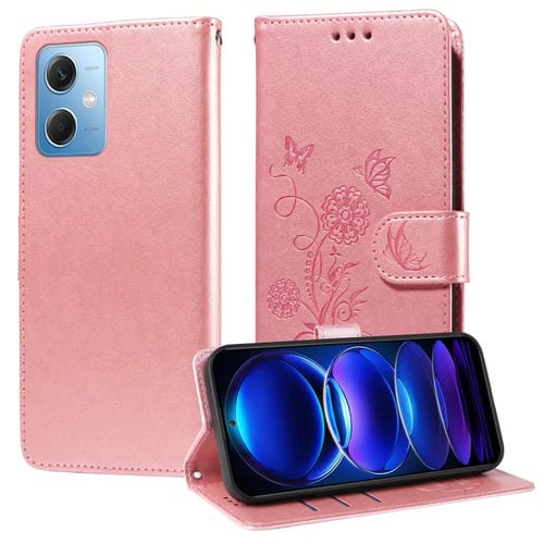 Funda de Cuero con Diseño de Mariposas y Flores En Relieve para Redmi Note 12 5G (Oro Rosa)