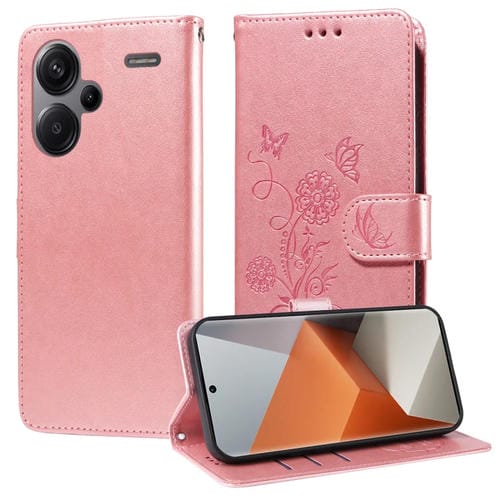 Funda de Cuero con Diseño de Mariposas y Flores En Relieve para Redmi Note 13 Pro+ 5G (Oro Rosa)