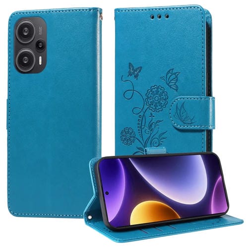Funda de Cuero con Diseño de Mariposas y Flores En Relieve para Xiaomi Poco F5/Redmi Note 12 Turbo (Azul)