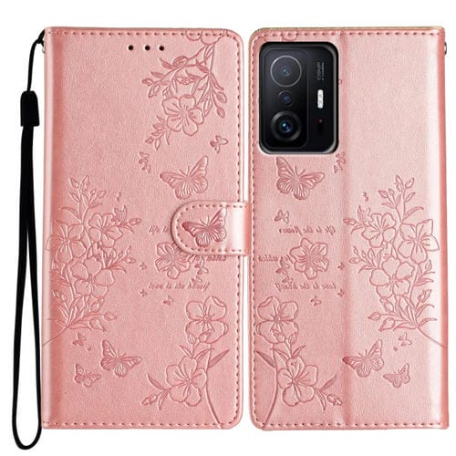 Funda de Cuero con Diseño de Mariposas y Flores para Xiaomi 11T/11T Pro (Oro Rosa)