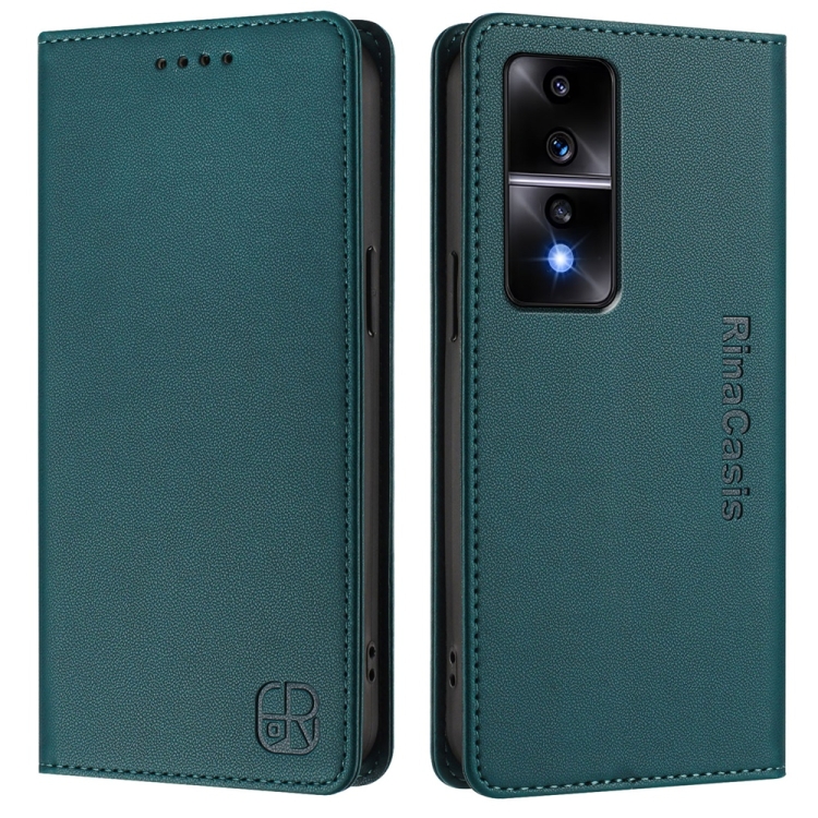 Funda de Cuero para Honor 80 GT RC01 con Doble Pliegue y Succión Magnética RFID (Verde Oscuro)
