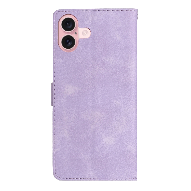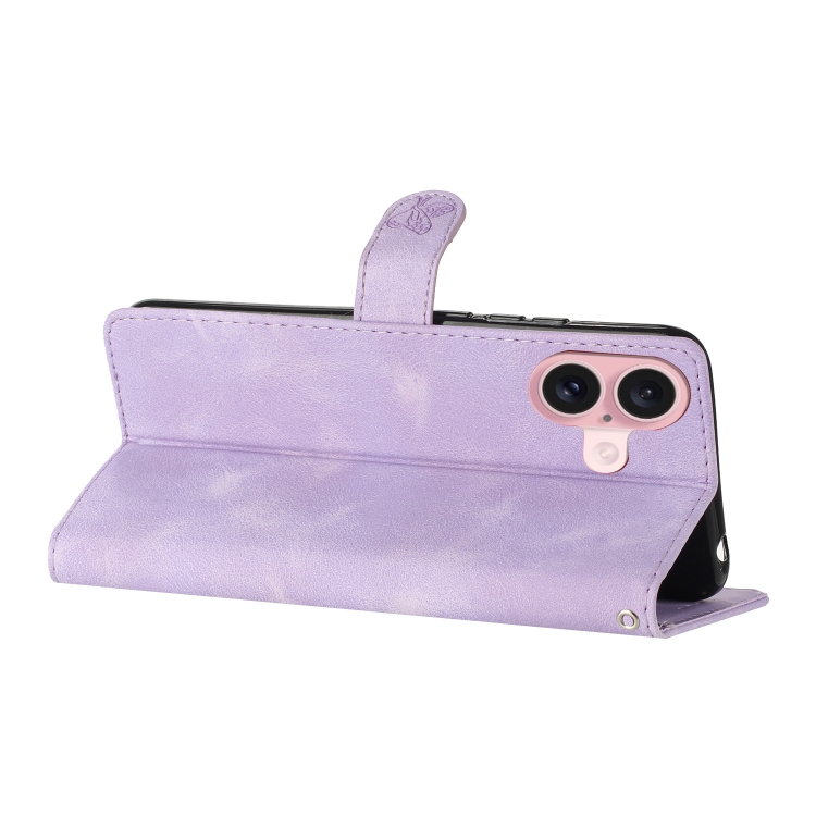 Funda de Cuero para iPhone 16 Estampado Flores y Mariposas (Morado)