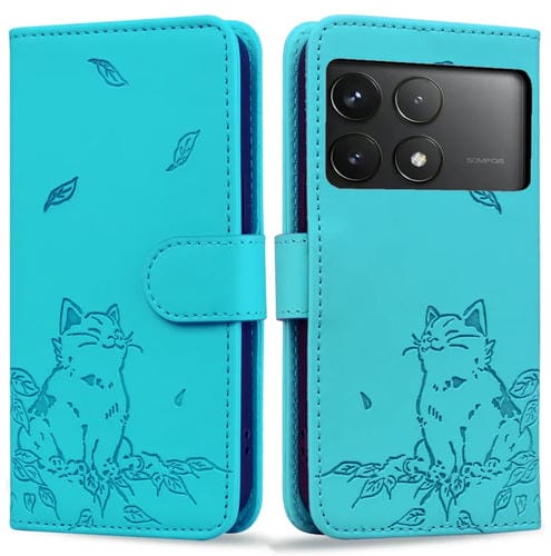 Funda de Cuero con Estampado de Gato para Xiaomi Poco F6 Pro 5G (Azul Lago)