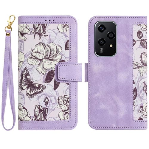 Funda de Cuero con Estampado Floral para Honor 200 Lite con Cordón (Morado Claro)