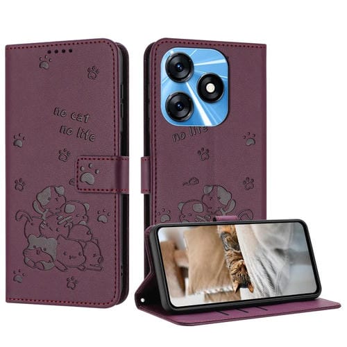 Funda de Cuero para Tecno Spark 10 4G y Spark 10C con Forma de Gatito y Cordón (Rojo Vino)