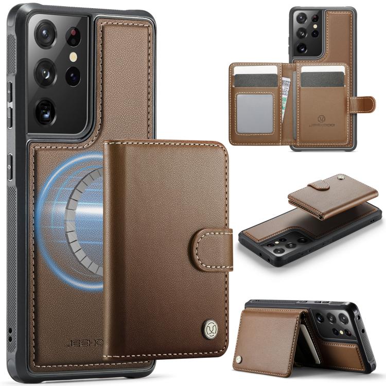 Funda de cuero con hebilla magnética para Samsung Galaxy S21 Ultra 5G JEEHOOD J09, con ranuras para tarjetas, estilo RFID y MagSafe (marrón)