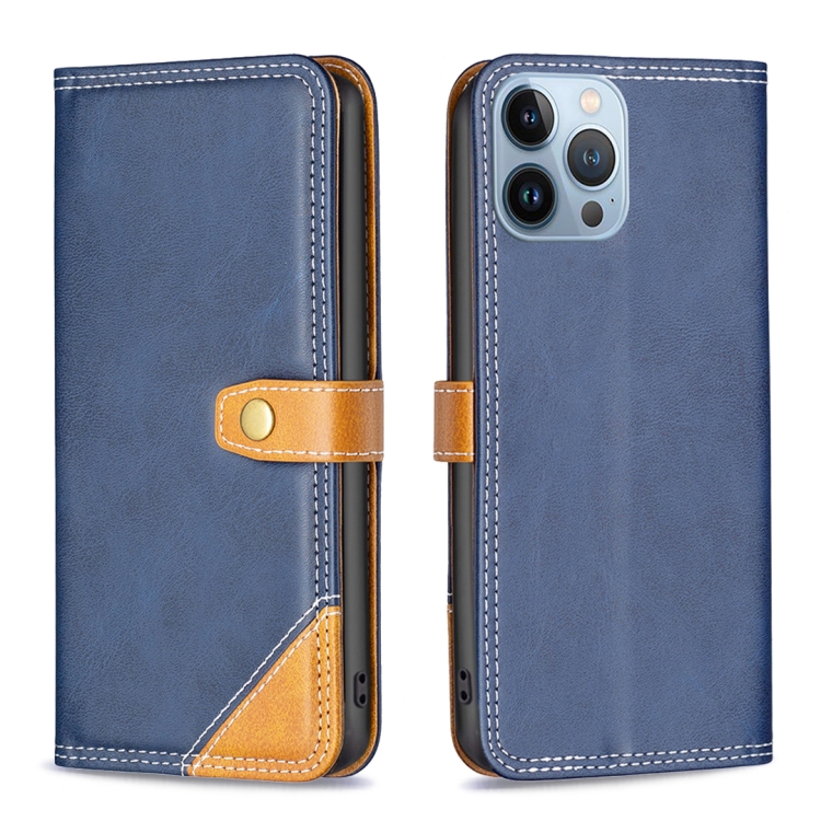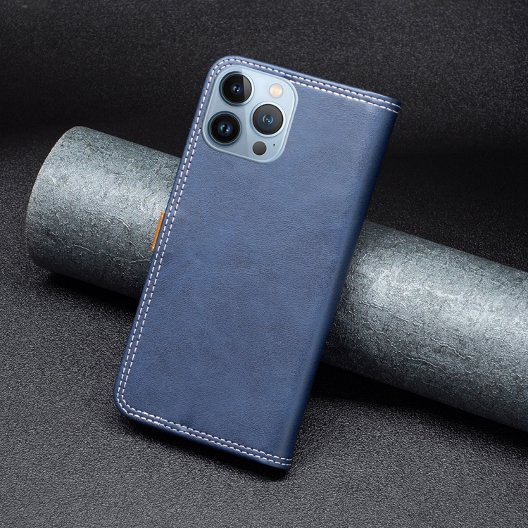 Funda de Cuero para iPhone 13 Pro con Hilo de Coser Doble a Juego (Azul)