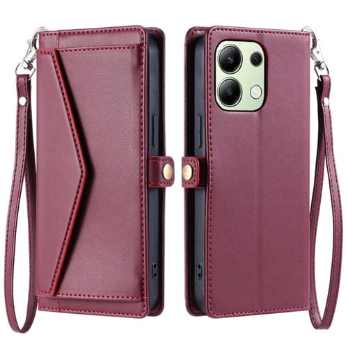 Funda de Cuero con Ranura para Múltiples Tarjetas y Billetera Global para Redmi Note 13 4G con Cordón (Rojo Vino)