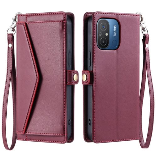 Funda de Cuero con Ranura para Múltiples Tarjetas y Cordón para Redmi 11A 4G Global Wallet (Rojo Vino)