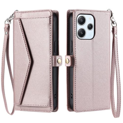 Funda de Cuero con Ranura para Múltiples Tarjetas y Cordón para Redmi 12 5G/12 4G (Oro Rosa)