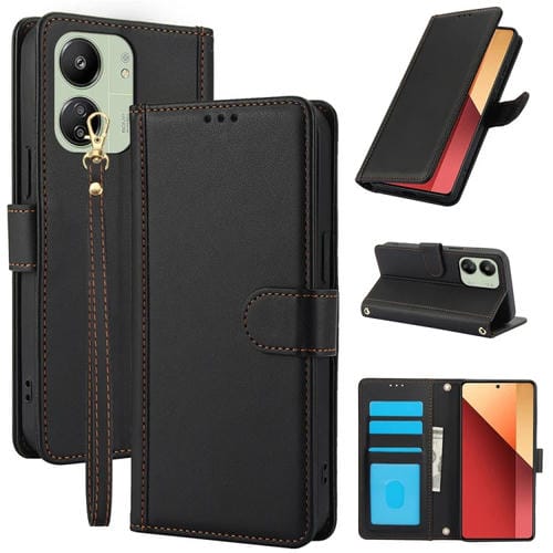 Funda de Cuero con Ranuras para Tarjetas y Diseño de Piel Sintética con Cordón Doble para Redmi 13C 4G / Poco C65 / Poco M6 5G (Negro)